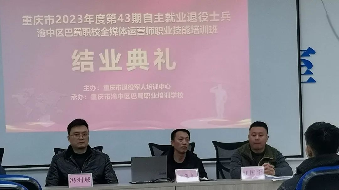 12月12日,由重庆市退役军人事务局主办、重庆巴蜀职校承办的重庆市2023年度第43届自主就业退役士兵·渝中区巴蜀职校全媒体运营师职业技能培训班圆满结业。重庆市退役军人事务局部长冯州域、汪国宇、重庆巴蜀职校常务副校长朱俊涛出席会议,结业典礼仪式由重庆巴蜀职校陈老师主持。